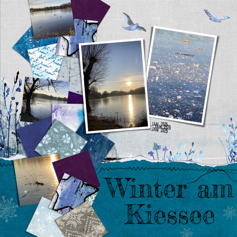 I decided against adding paint splatter or other elements because I want to leave some space for your own interpretation. So the last thing missing is the title and a journaling spot. For the title I chose the font ‘Fredericka the Great’. Since I wanted the journaling to follow the line of the squares I created a path with the pen tool and converted it to text frame. The font is ‘Patrick Hand’.