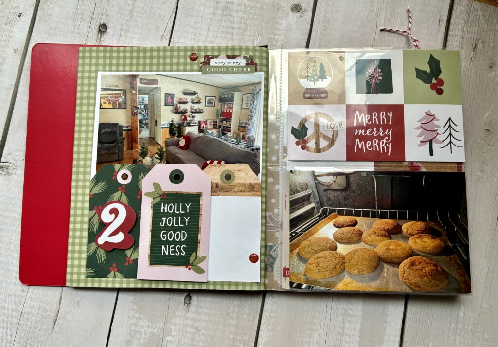 The sketch provided for two portrait photos, but I used one landscape photo of my shelf of December Dailys. Notice it only goes up to 2022. Yes! I’m 2 years behind! I placed tilted photos along the left side instead of the bottom like the sketch suggests.