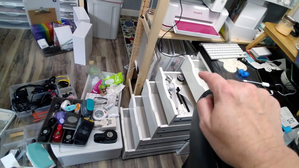 These small drawers are from the general storage department. This kind of organization is both cheaper and easier to find than specialty craft organization. I was able to pick up bins when they were on sale. I could also add more bins over time if needed. They tuck away into smaller nooks. Plus they store add things like extra glue, trimmer blades, power cables, reinkers, etc.