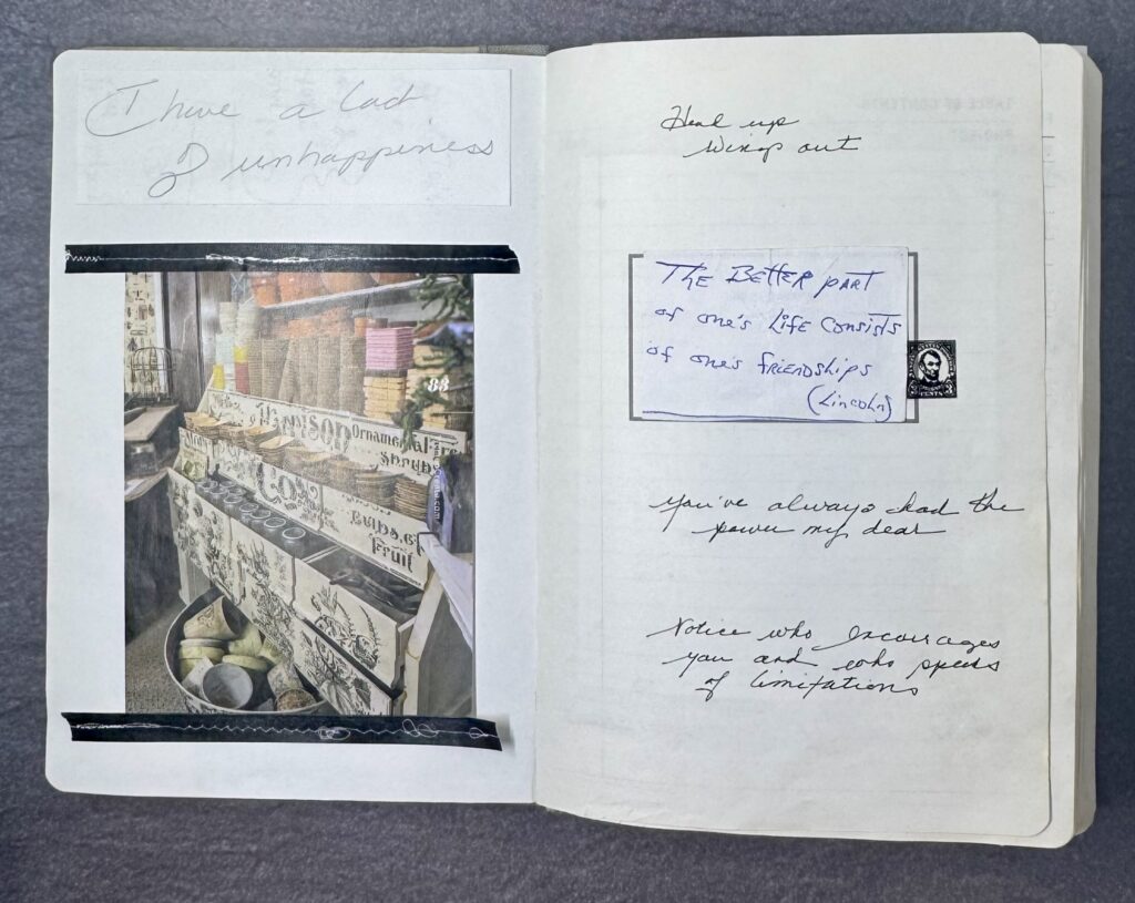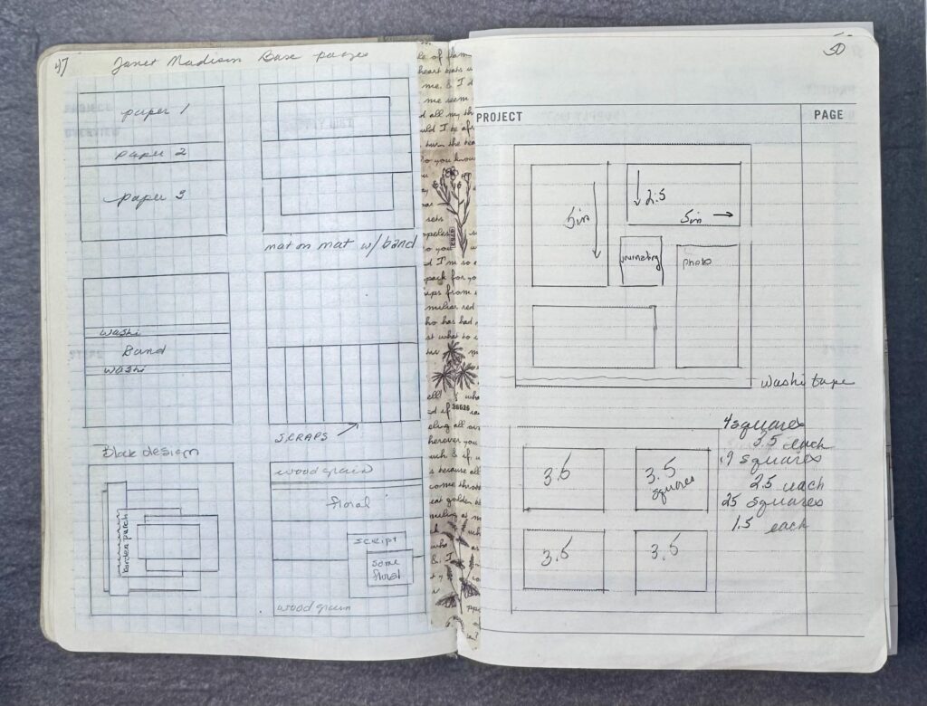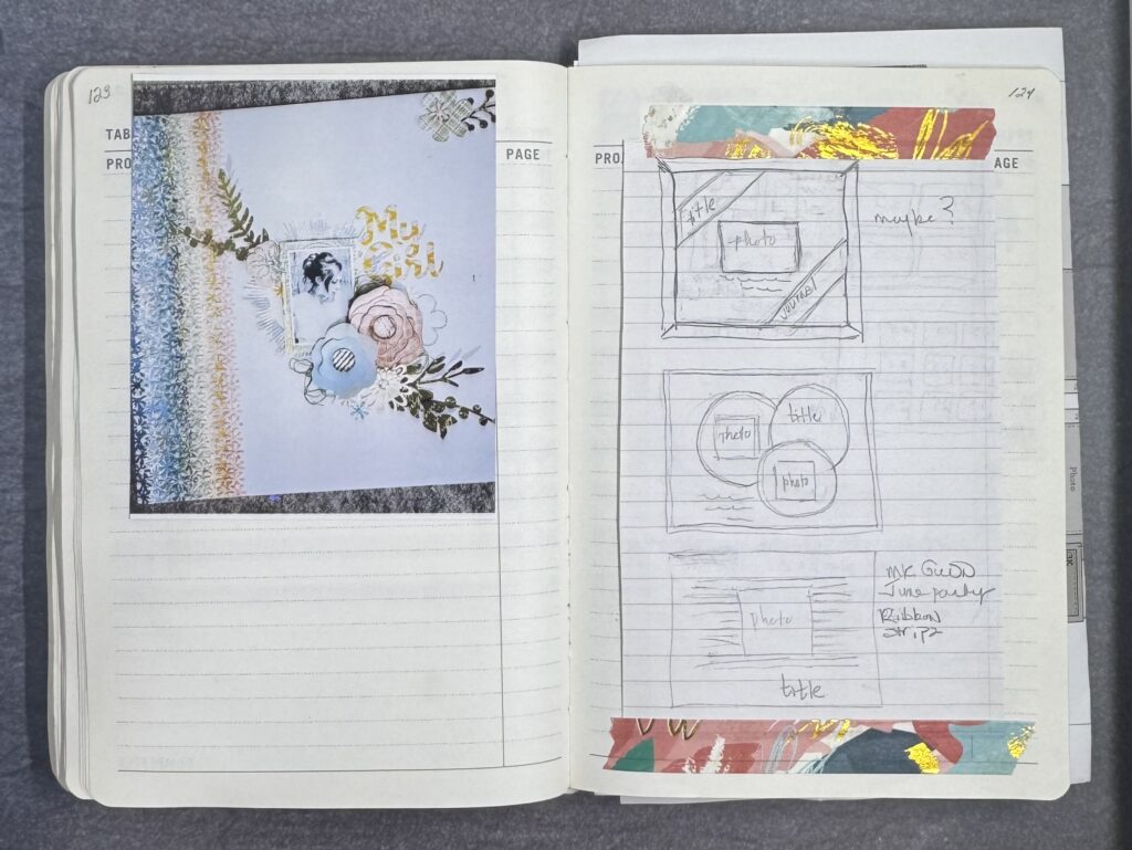 This is my first secret weapon. This is a notebook I have been adding layouts, sketches, and quotes to for the last ten years. When I have a creative slump this is the first element I grab for ideas. There are even a couple of “someday” dream spaces within the covers. Here is a small peek inside-