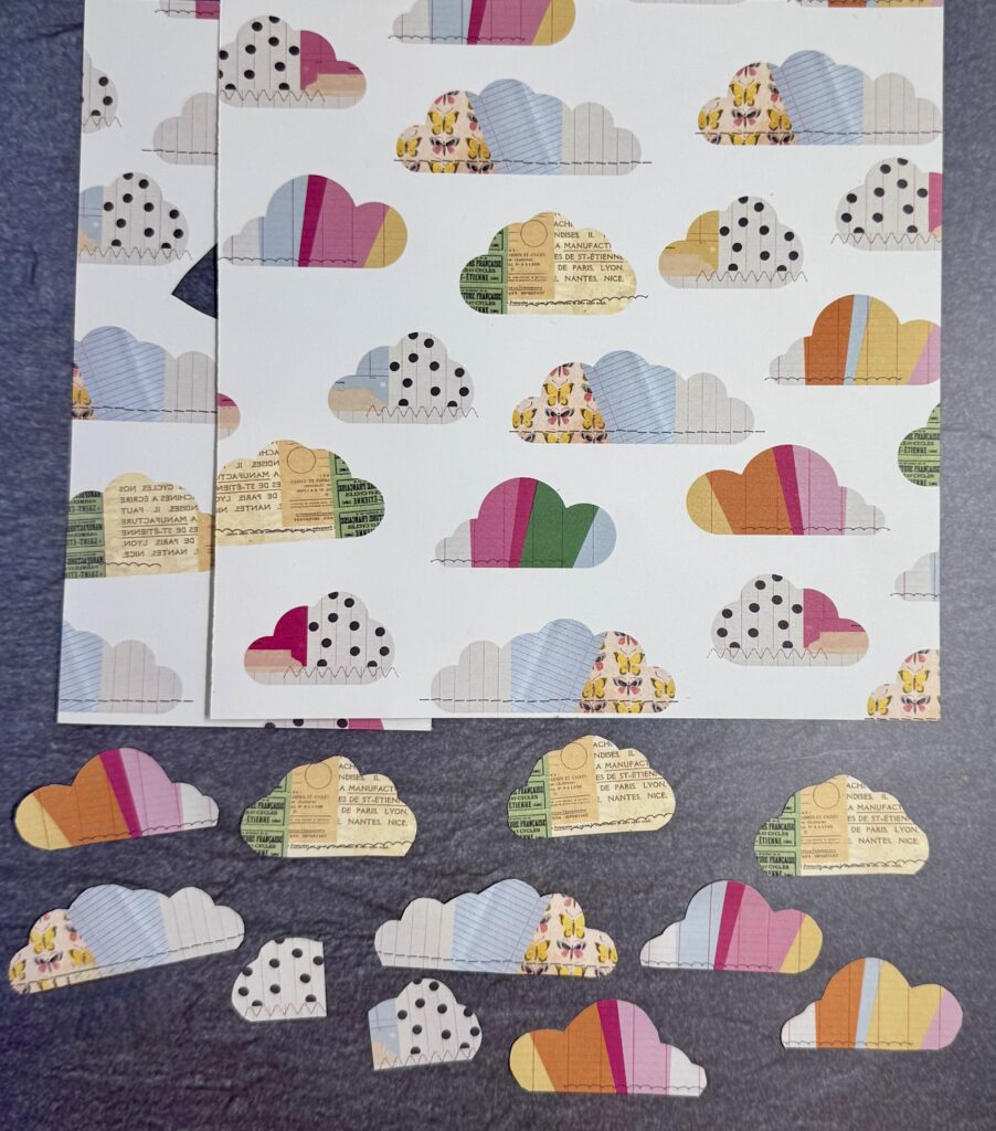 I just could not make this pattern work as a background so I cut the clouds out and used them as embellishments.