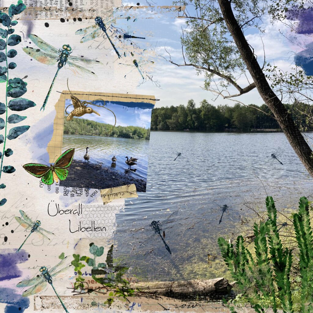 On the fourth page is a lot more variety in elements but the dragonflies are the main topic, represented by it’s repetition all over the page. The title of the page reads “Dragonflies everywhere”.