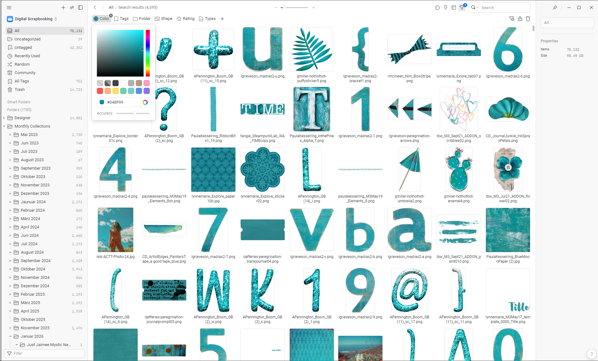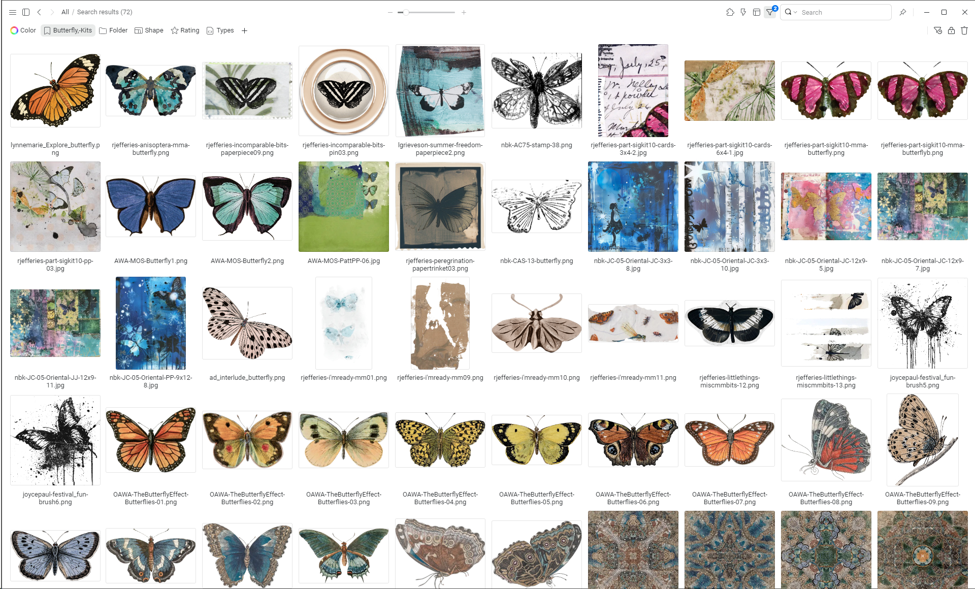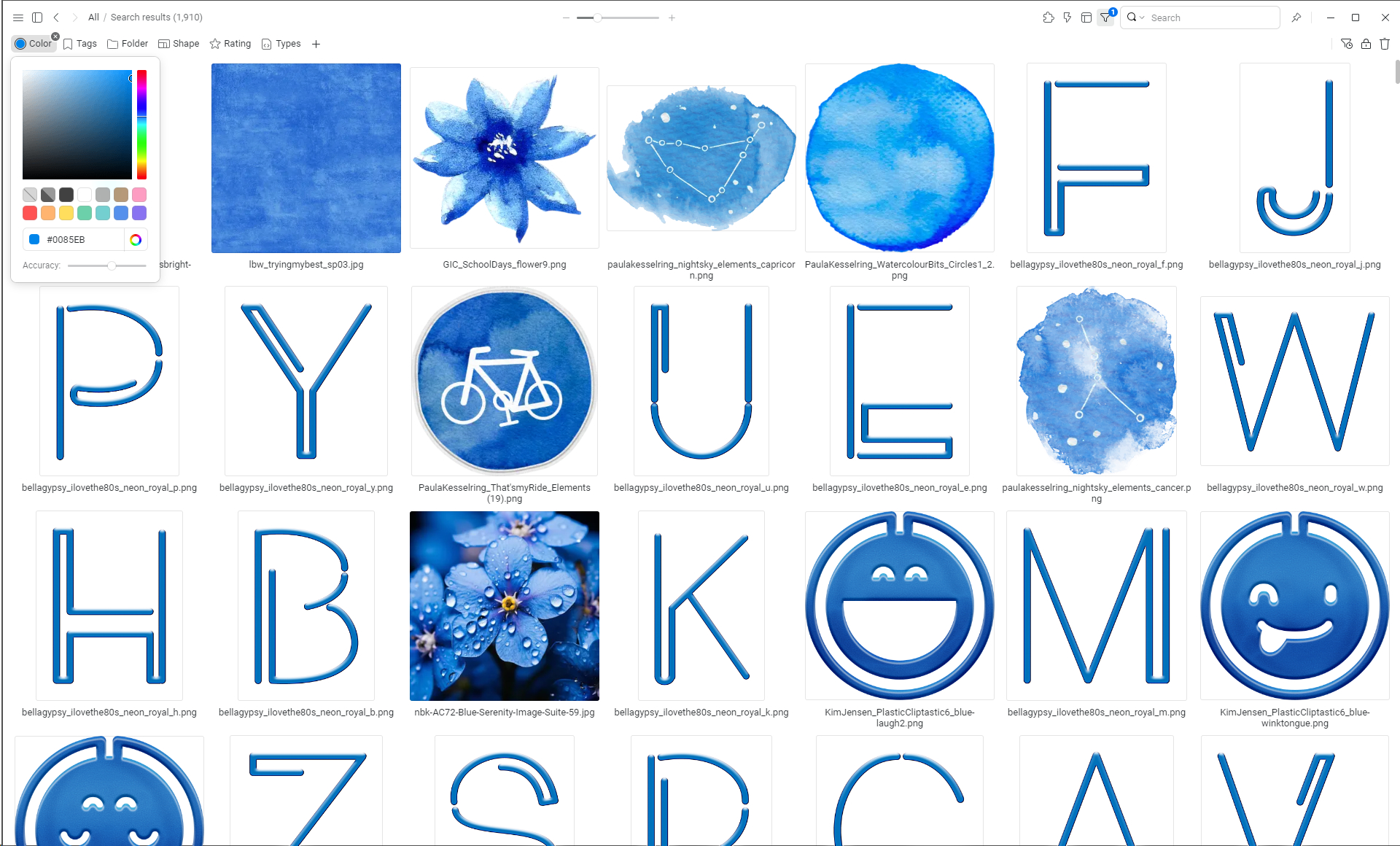 I use it mostly to find matching colours for an item I want to include in my layout. If you click on an element eagle shows you the colour range in dots below the image on the right side bar. If you click on one of the coloured dots you can search for that colour in the same folder. But you can also switch to “All” and search all your files for that colour. I think it is a very fun way to find matching kits I would never have combined otherwise.