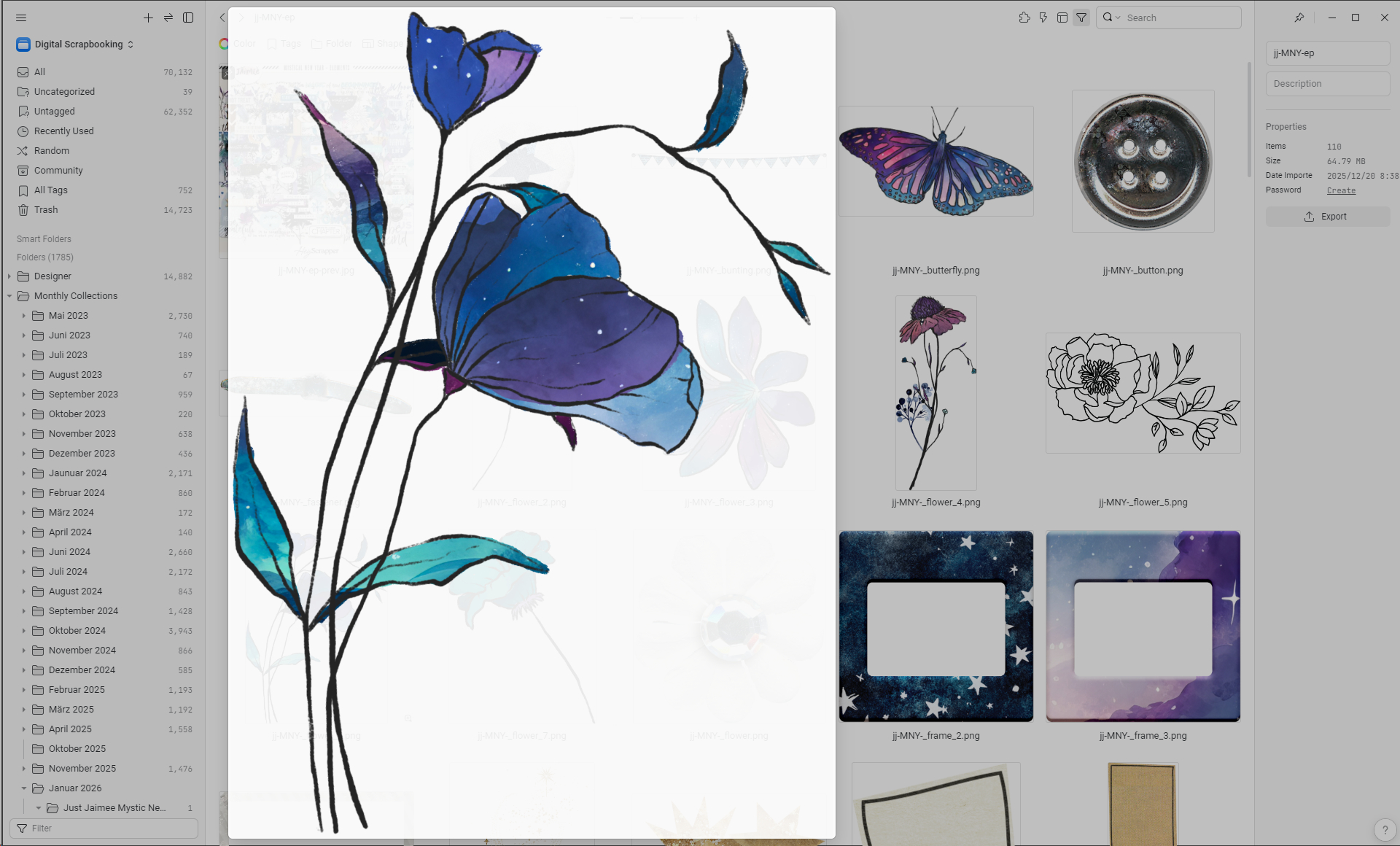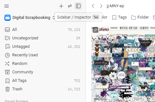As a windows user the flexibility of image display in eagle is another great benefit. You can use the slider at the top center to continuously adjust the size of the image display from quite tiny to very big. And there is a small magnifying glass in the lower right corner of each file. When you move the mouse over it, a full-size preview of the image is displayed. This is so convenient! You don’t even need to click to see the image in detail. And I love that you can disable the sidebars with just one click so that you have your full screen to view the pictures.