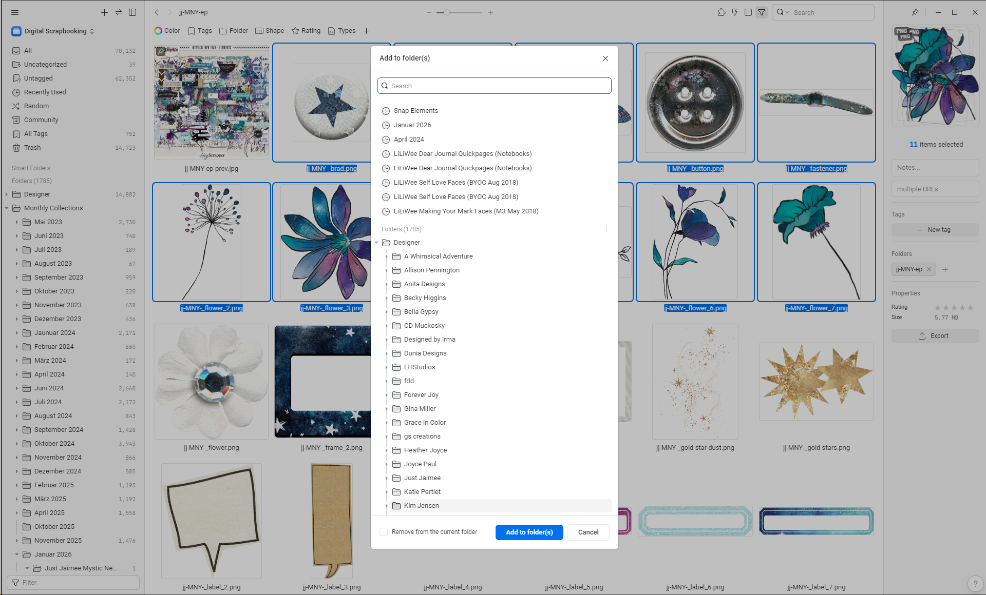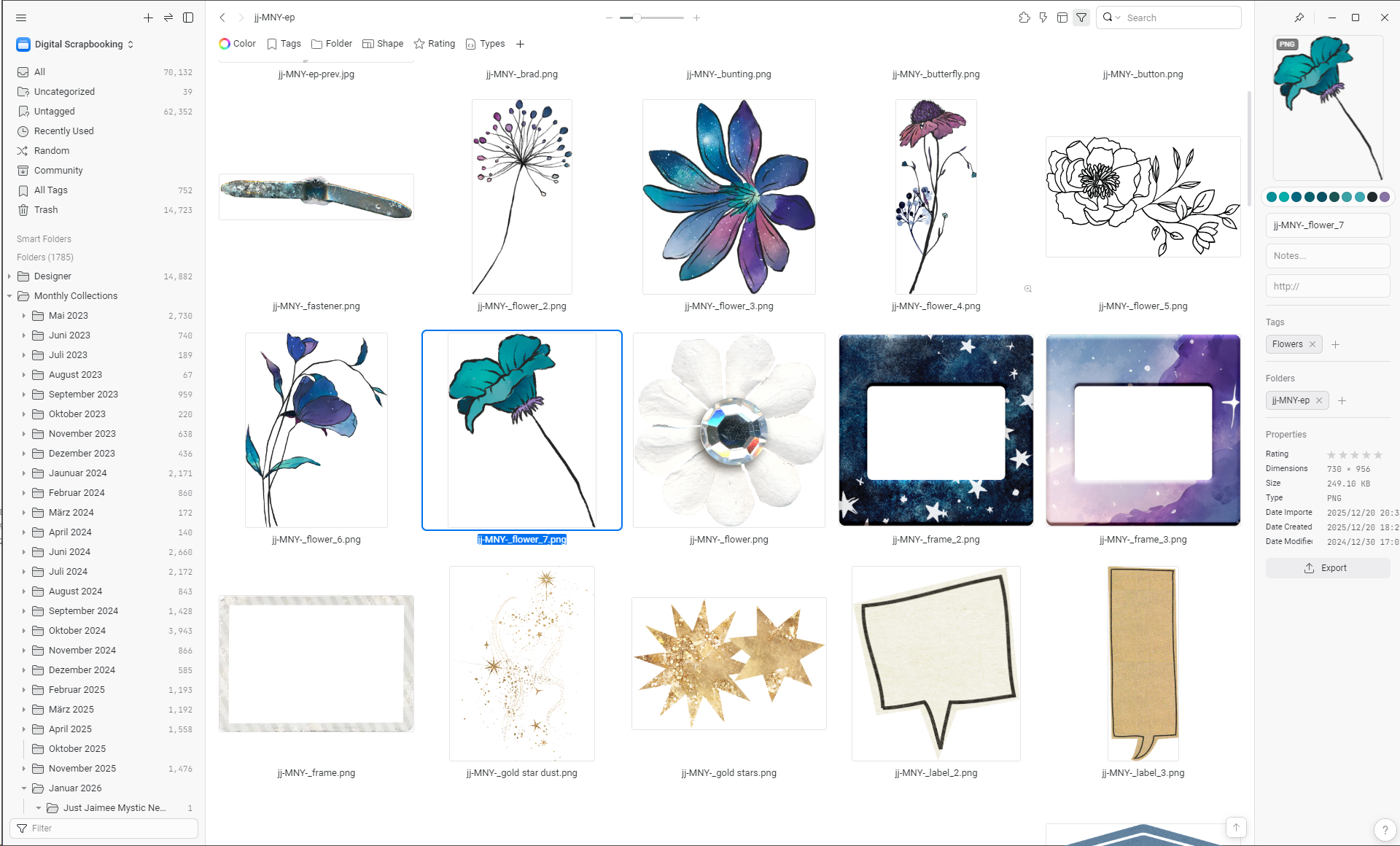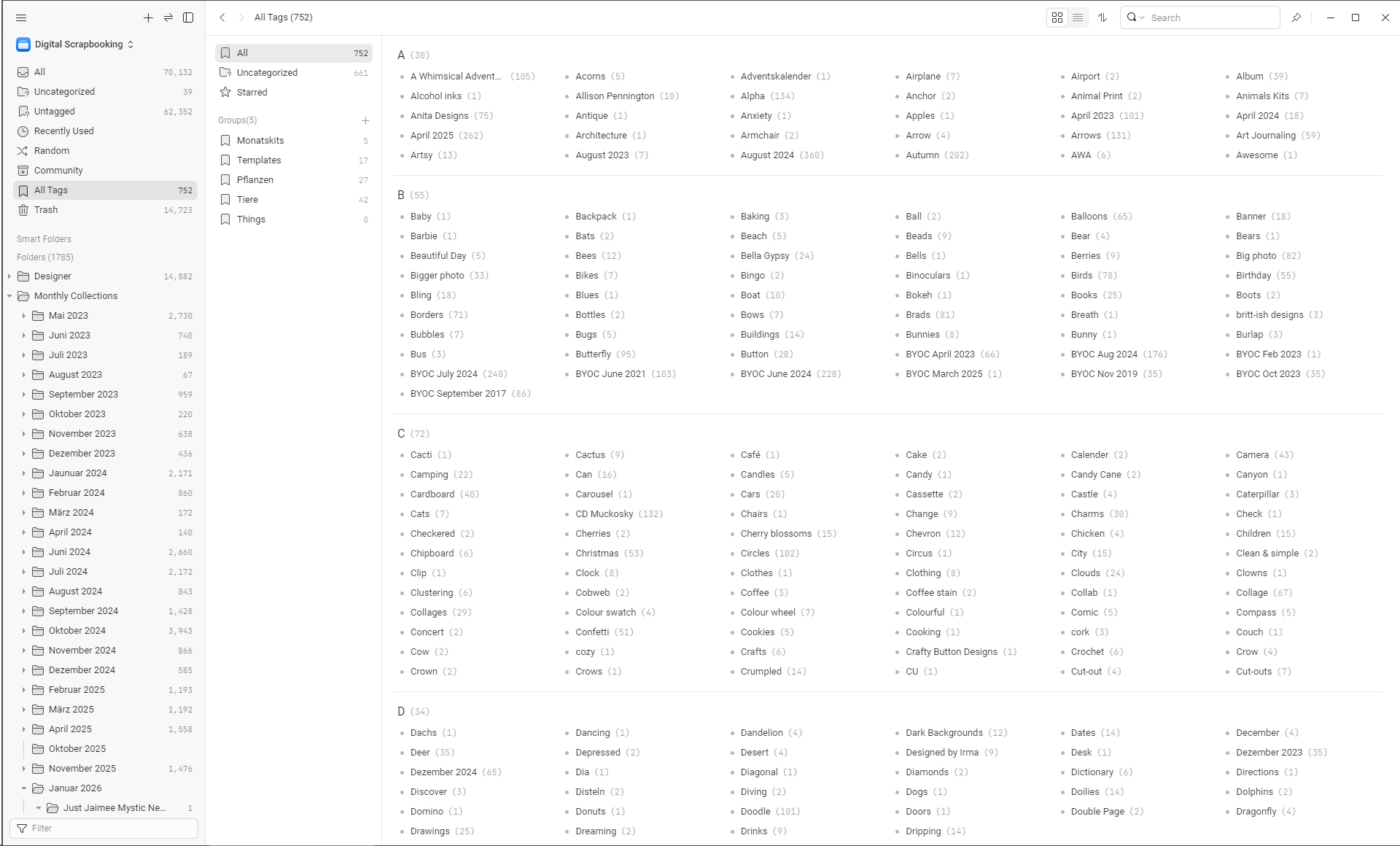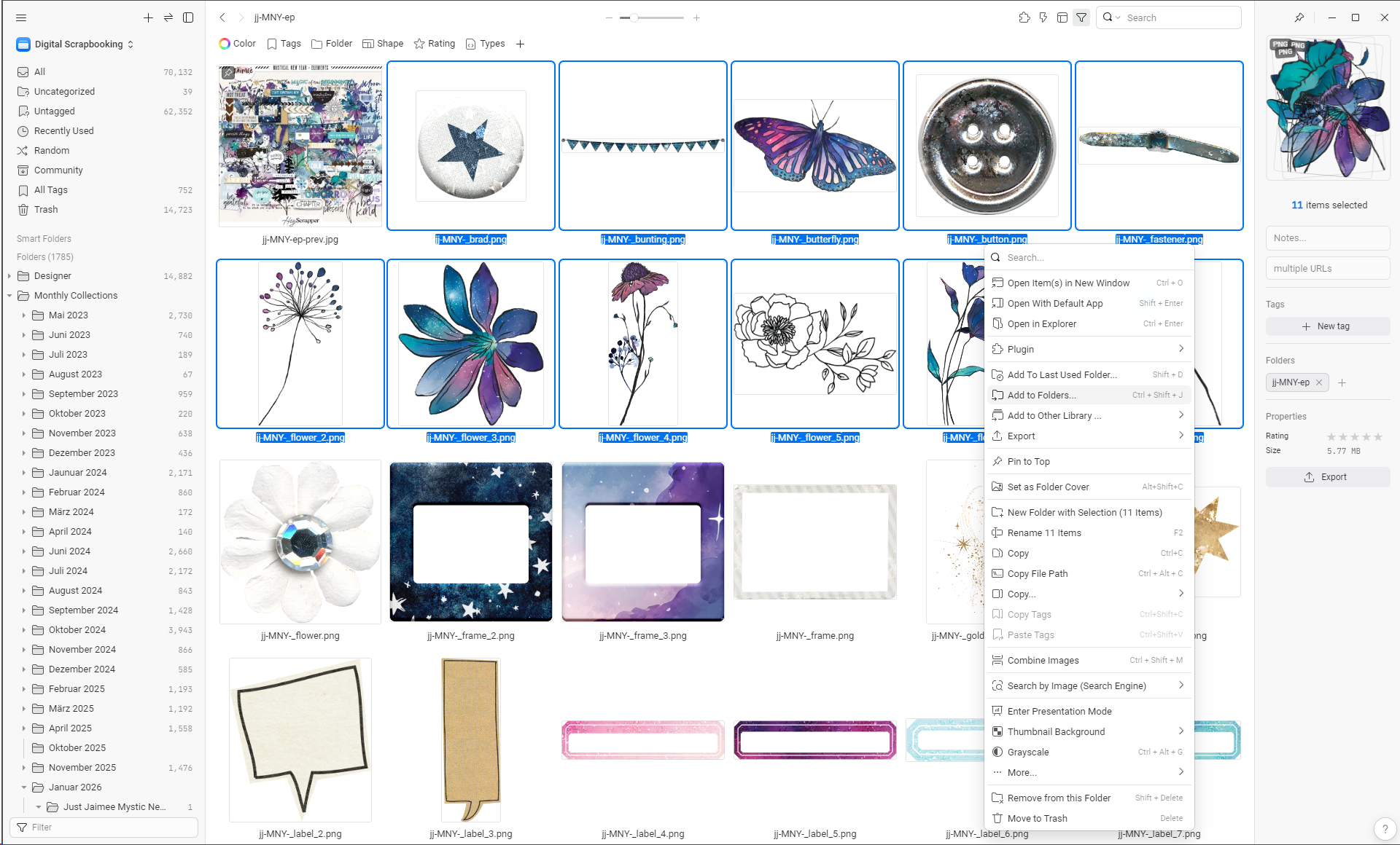 First of all, we should think about how we want our stash to be organized, what is important to us. I am the type of literal scrapper who loves to use matching items for my photos and the topic of the page. And I mix kits like crazy in one layout. So for me the most important thing is being able to tag files individually to find just the one I REALLY need right now. 😉 If you usually scrapbook with one kit per layout, it might be more convenient for you to tag the folders and have a good overview there. So the way of organization must suit your needs.