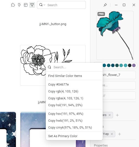 Another thing I love to use is the colour search. You can just choose a colour and search any folder you want or search “All” on the upper left side where all of your files of that library are included.