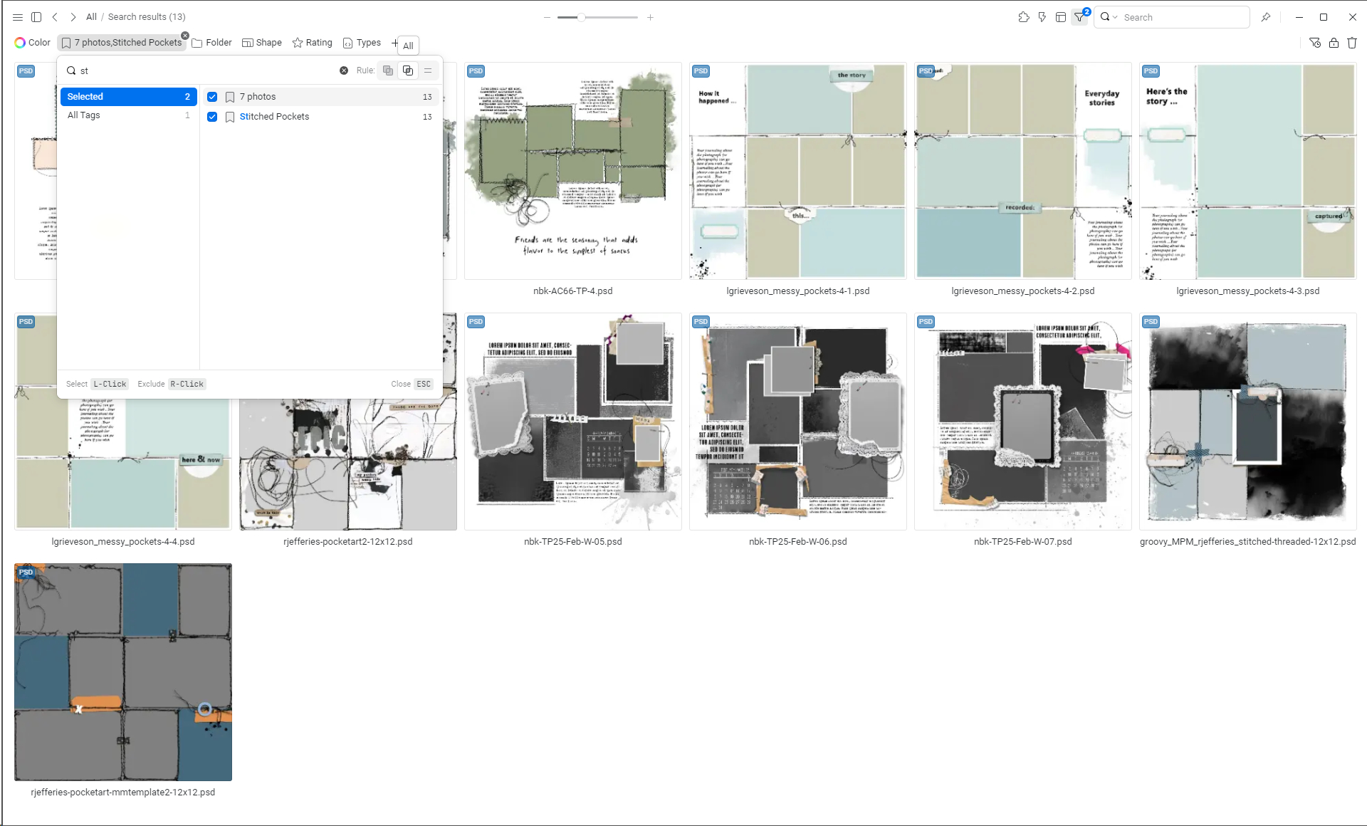 You can also apply multiple tags at once. For example a number of photos and the style of a template, like ‘7 photos’ and ‘stitched pockets’ and you will get whatever stitched pocket templates you got for 7 photos. Or you could search for a certain item from a certain designer. Just make sure you choose “all” in the upper right corner of the tag filter pop up. Otherwise, all files for each of the tags would be displayed instead of all files that contain both tags together.