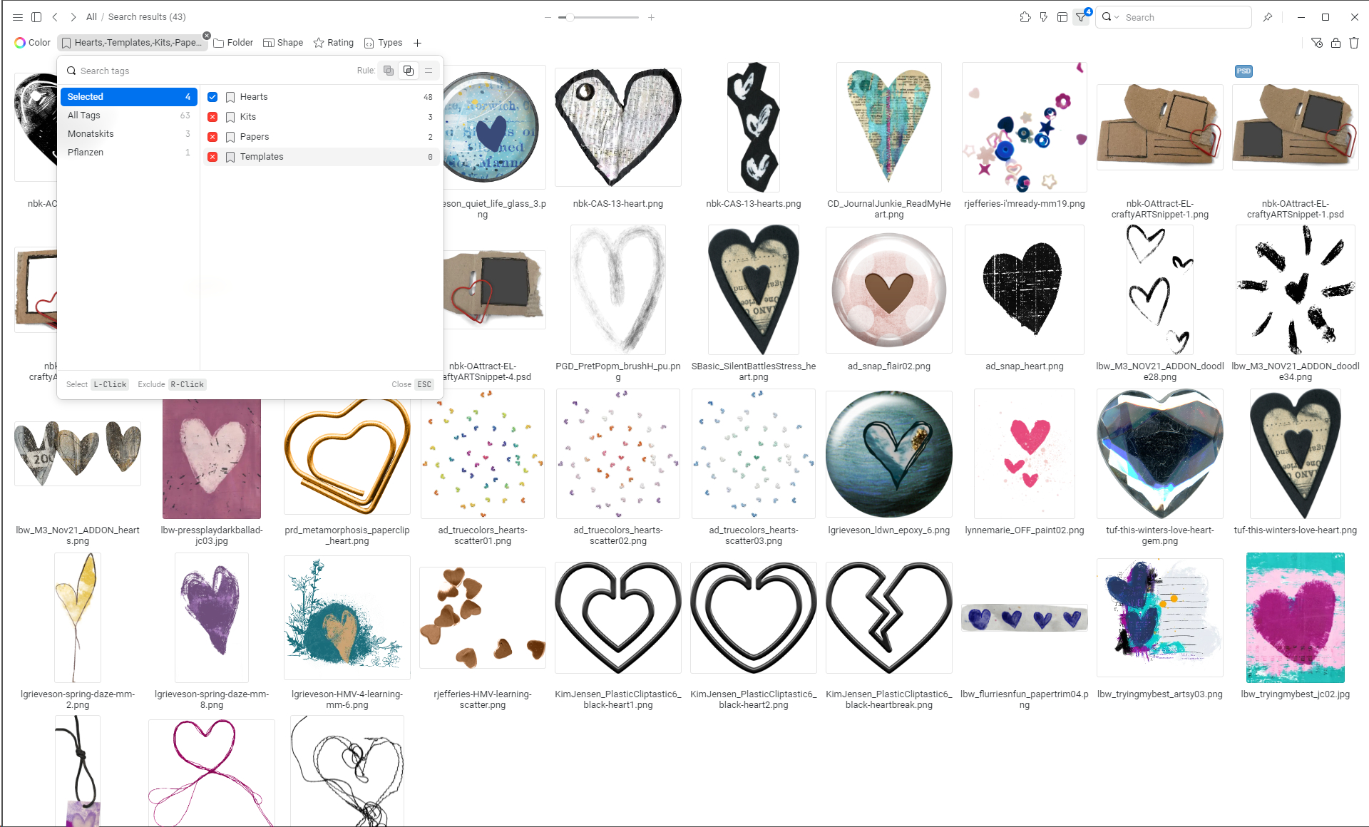 It is also possible to exclude tags while searching for others. For example, you search for ‘hearts’, but exclude ‘papers’, ‘templates’ and ‘kits’ because you are looking for elements only. To exclude tags you just right click on them in the tag filter pop up.