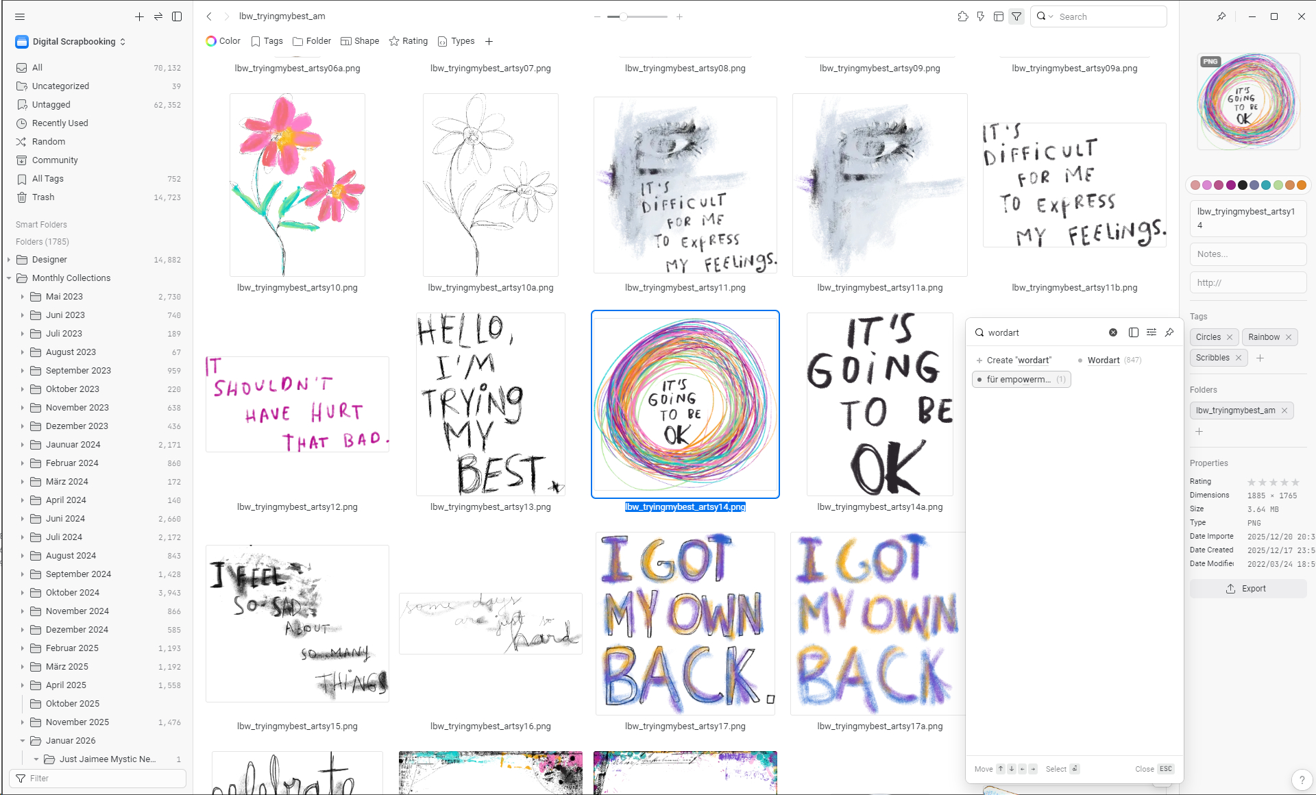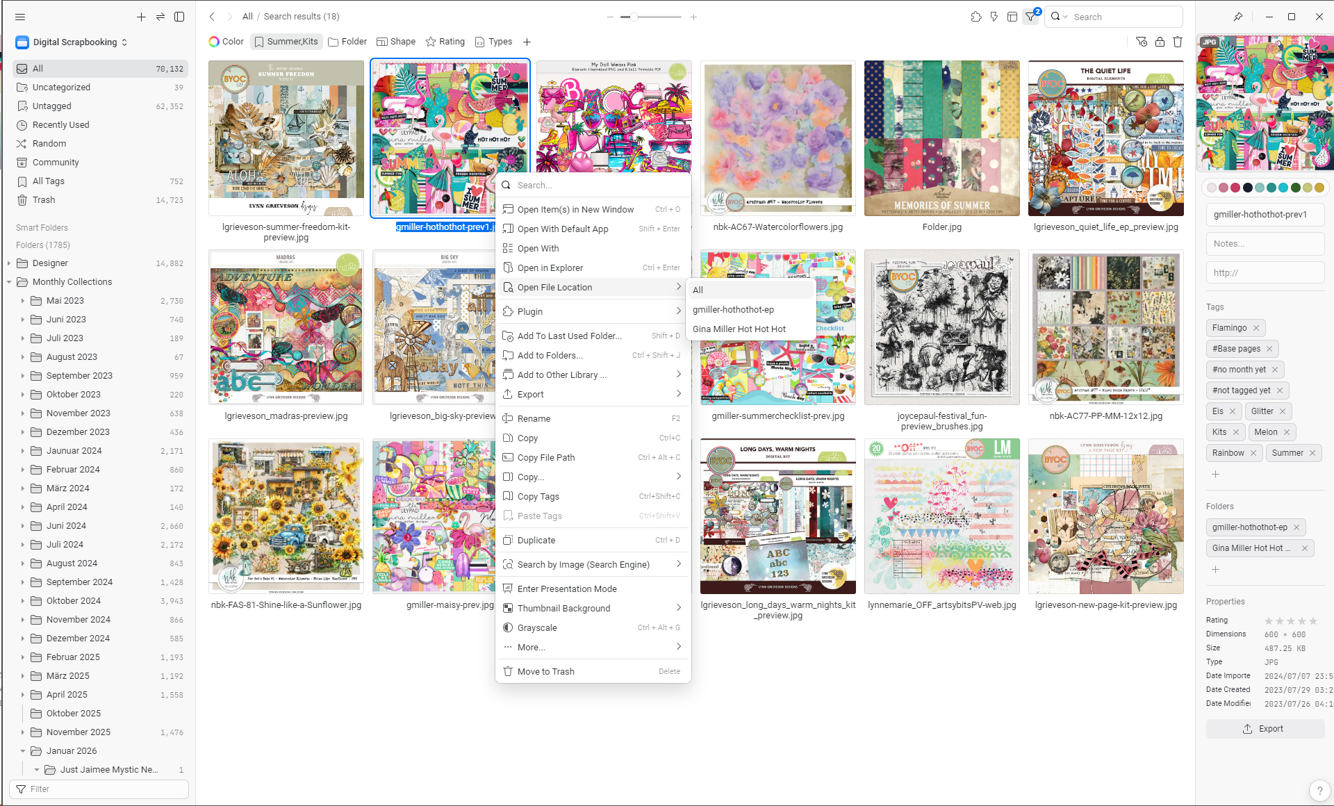 If we can’t tag folders, it becomes difficult to tag our kits in general. Since I don’t want to miss out on this, I use the preview images of the kits and add the tag ‘kit’ next to the thematic tags so that I can also search for kits on specific topics. You can always access the corresponding folder for a file by right-clicking and selecting “open file location”. That way we can get from the tagged kit preview to the folder.