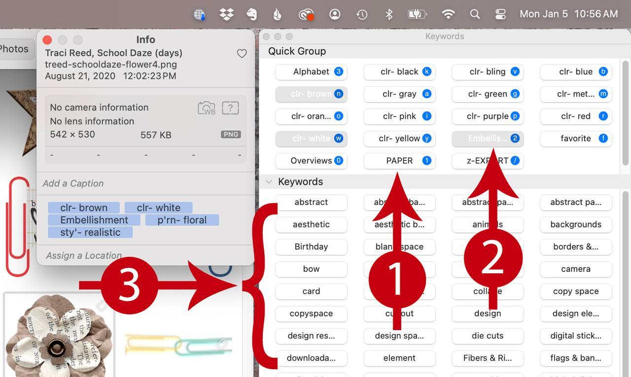 Hold down the option key while clicking on your photos app to open it. You’ll see the dialog box above pop up. Note on the graphic that is called “Choose Library” (arrow 1). You’ll come back to this box every time you want to move between personal photos and your digital products. For now, see the option that says “Create New”? That is what you want to do now. It’ll have you name your new library. In my case I simply called it Digi Scraps. Save that new library. Now that you have a new library, start loading your digital products into the library. For me, once I load them I then move the originals off to a thumb drive. Photos keeps a full copy of your file; you can export any files you want to use in your digital scrapping application. You don’t need both the original and the Photos copy. So moving the originals to a separate drive will save hard drive space. These thumb drives are backups in case anything happens to your computer. Trust me, I’ve had hard drive meltdowns! Backups matter.