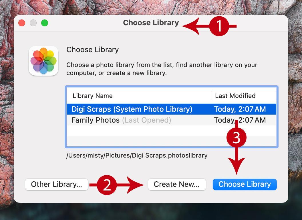 The basics of Keywords are to add categories to your pictures. These categories need to work for how you want to find things. I have big broad categories (arrow 1 and 2) and then finer detail categories (arrow 3**). The big ones I can assign a “quick key” to. That just means I can press one single key on my keyboard to give that photo the matching category. For example I have a “Paper” category (arrow 1), and “Embellishments” category (arrow 2) and various other categories. If I press “1” on my keyboard while my photo is selected, Photos will add the “Paper” category. For most of the finer detail categories I don’t have a quick key. Instead I simply click on the category to add that keyword. These keywords can be altered, renamed and changed their quick key assignments. Any changes you make will affect all your tagged items. That also means if you delete a keyword, it deletes it everywhere. So do be careful with that. Now you can see why keeping digi supplies in a distinct library from your life photos is better. Your keywords for life will be totally different than those for digi products. If you keep them all together your keyword list will be long and complicated. The final piece of info on this process is how to switch between your family photos and your digital supplies. You need to quit Photos. Then go back to the first step: hold down the option key while clicking to open photos. You’ll get that dialog box again.