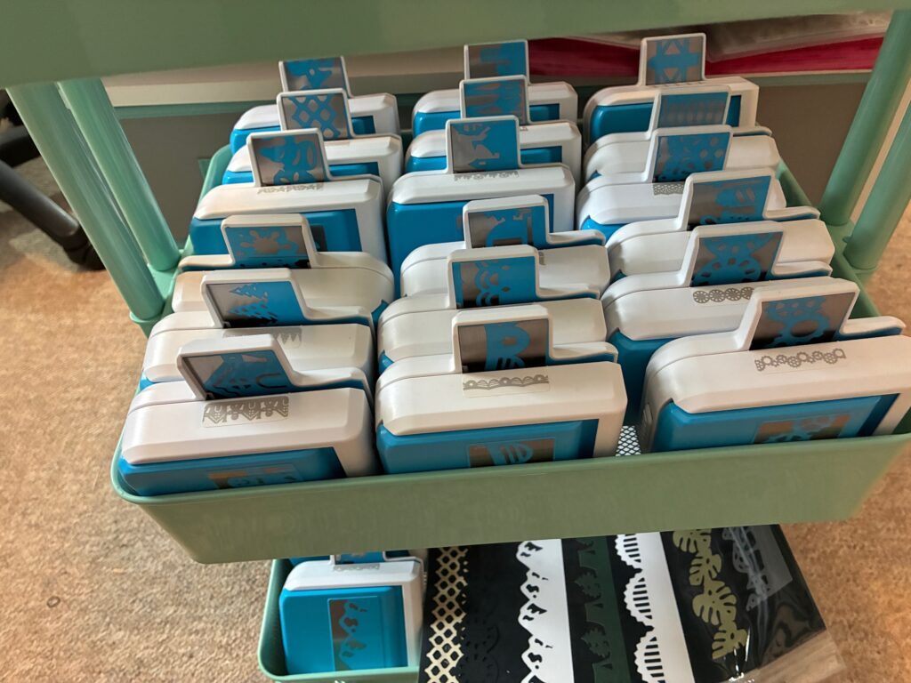 I was able to get these punches off a shelf I was storing them on. They are very bulky and heavy, causing the shelf to begin sagging They were also thrown into a basket which made it hard to see what I had. I moved them to a cart where they are much more accessible. I am a very visual person. I need to see it so that I use it.