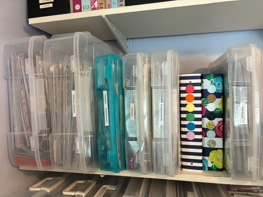 I put my new storage cases to good use. I had two smaller cases for my Autumn papers and embellishments. After purging some I was able to fit it all into one larger case. Yes, I store them on their side. It takes up less shelf space and it’s easier to access.