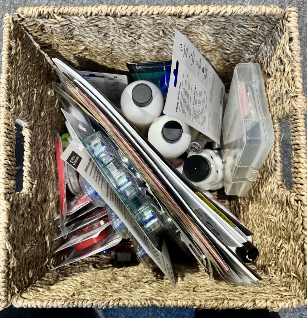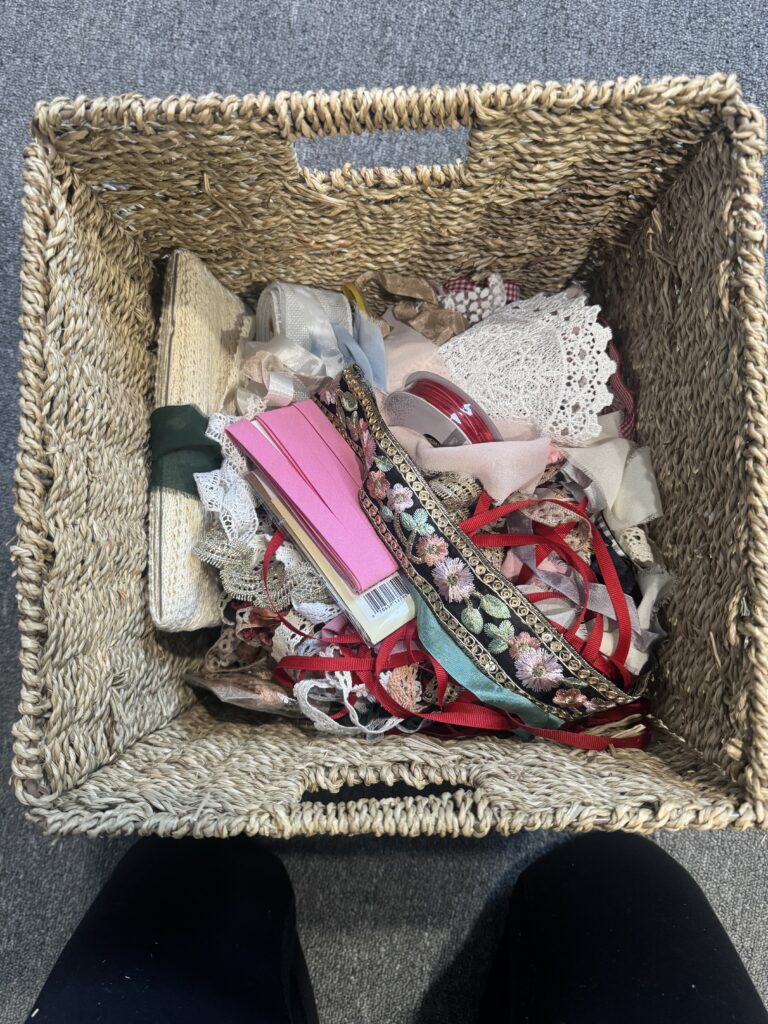 What did work were my ribbon and adhesive bins. I cleaned them up a bit, got rid of a few things and I will continue to use this storage. I did go off the rails a bit when I found some sweet little wooden bobbins to store lace and ribbons. I nipped that in the bud after the fourth bobbin.