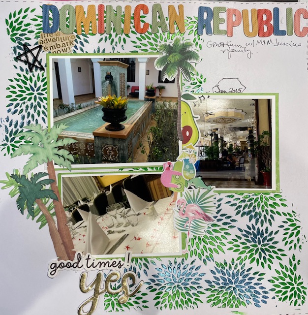 Dominican Republic – I would also like to share a fun 2025 March Calvinball layout. The photos are from a trip to the Dominican Republic and are just pretty views of where we stayed. For the layout, I used 2 Nuvo Glacier pastes through a stencil. I made a stitch line around the outside of the page with pen. In the center, I used all my fun Calvinball ephemera. Palm tree, music notes, avocado, sloth, flamingo, drink, star, dolphin, label, frame, hexagon & the date. I think I counted 12 points for the page. It was so fun trying to get the items in the challenge onto my page.