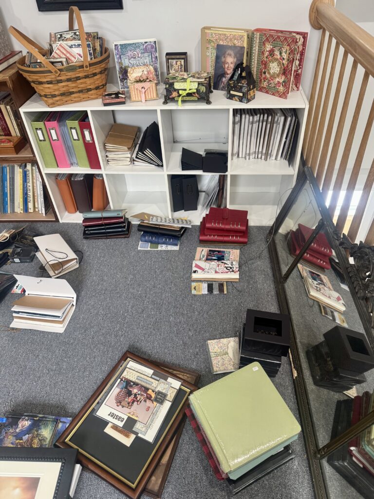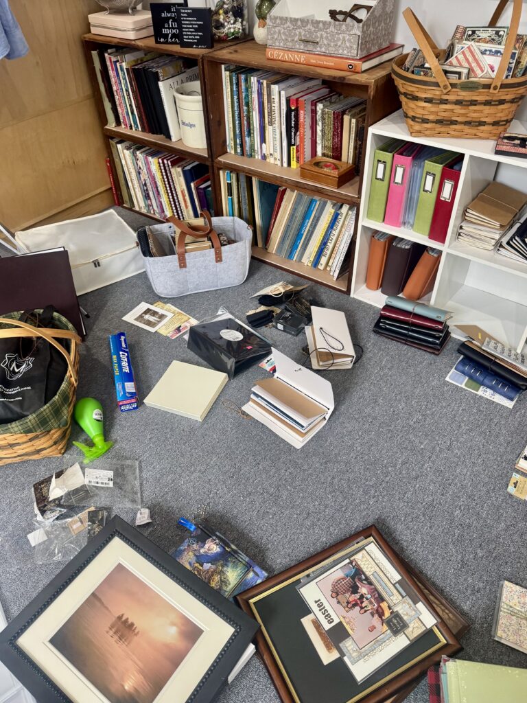 This is the first area that I tackled. This is where I keep album supplies, Traveler’s notebooks, finished projects, pretty much a mish mash of “stuff” If there was no room in the bookcases the floor became additional storage. Here is the result-
