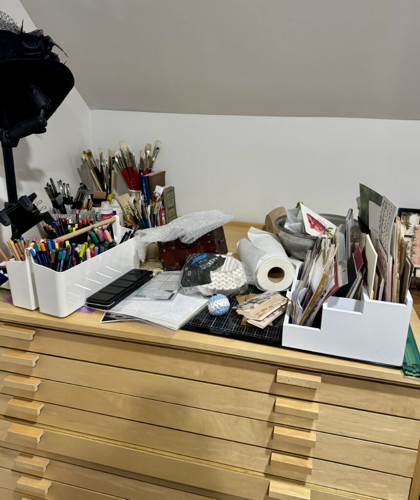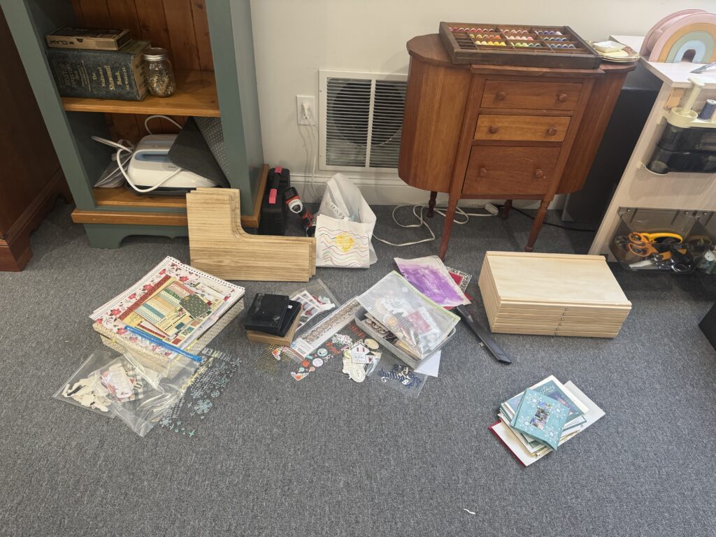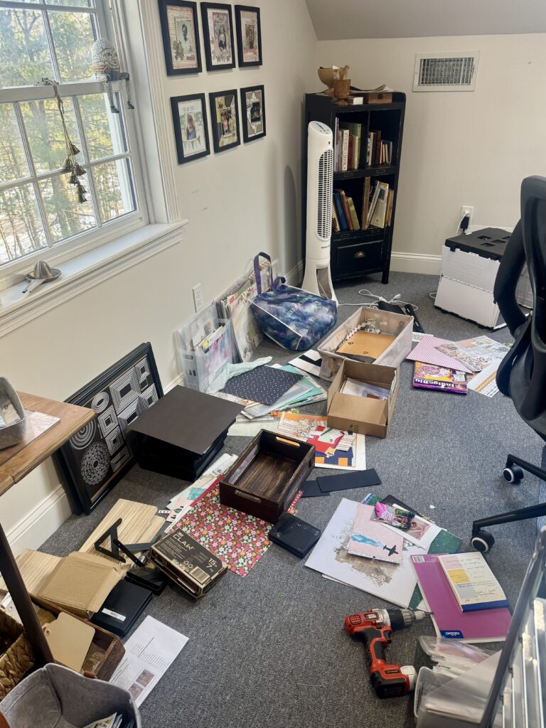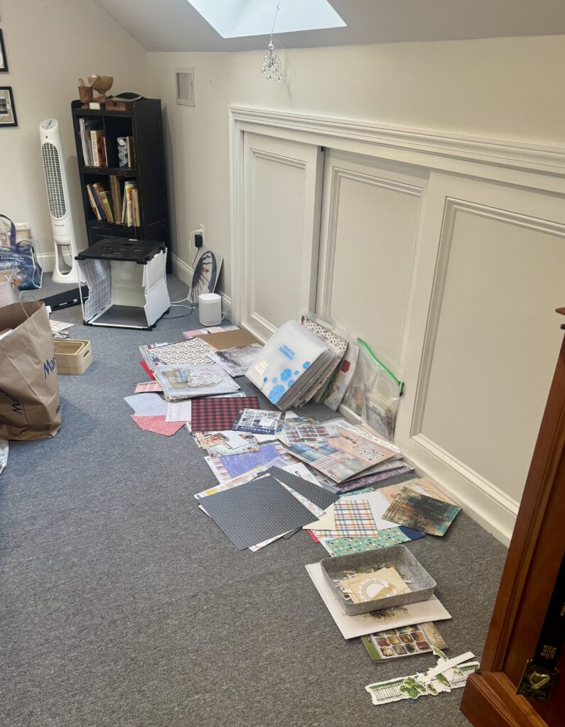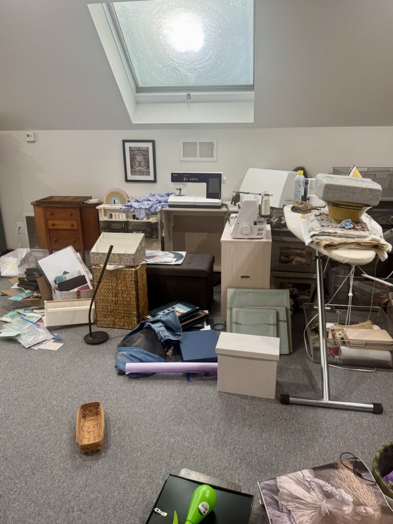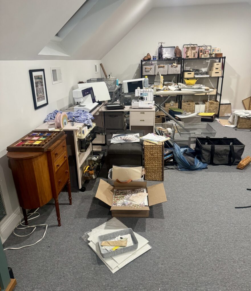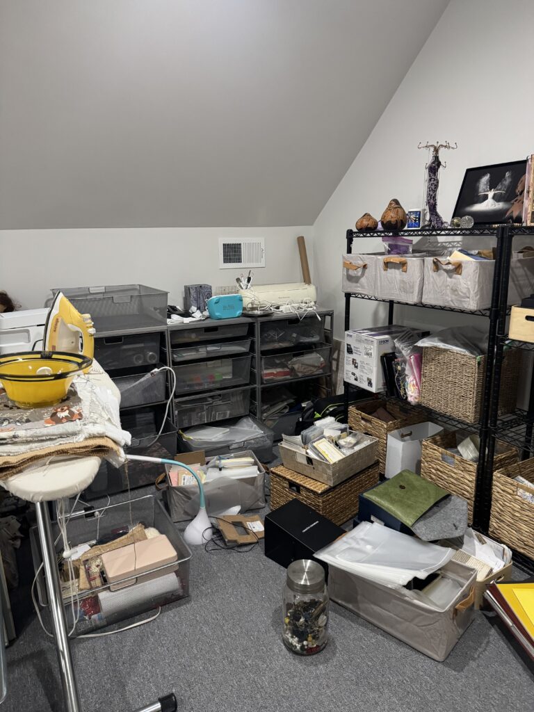 Last month I left you with a studio in complete disarray and I am proud to report that I have made a lot of progress in the last 3 weeks. I picked a section at a time and let me tell you I was ruthless! I used boxes for donations, trash, a “Why is this in my room?”, and of course our favorite the ever present UFO’s.