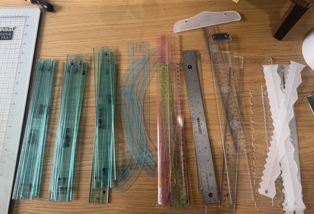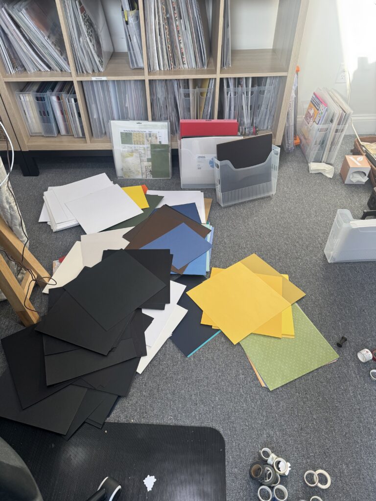 The plan going forward is to keep a set in my crop bag and the rest in a drawer, not sorted by where or how I use them, but a large category known simply as rulers. Phew! That made me feel so good saying that. My washi tape is in one place not scattered around the room in various jars. The thing about washi tape- it gets stored away, it loses its tackiness or worse it takes you half an hour to tear off six inches of tape. Unfortunately I had to part with a number of rolls that just could not be used. I was going to give some to my grandchildren but realized the rolls would just end up back in my lap cause they needed help so I’m not going to do that to myself or them. All my cardstock is in one place sorted in ROYGBIV order. Paper thin cardstock was placed in the grandkids art cart leaving me with good product I’ll be happy to use.
