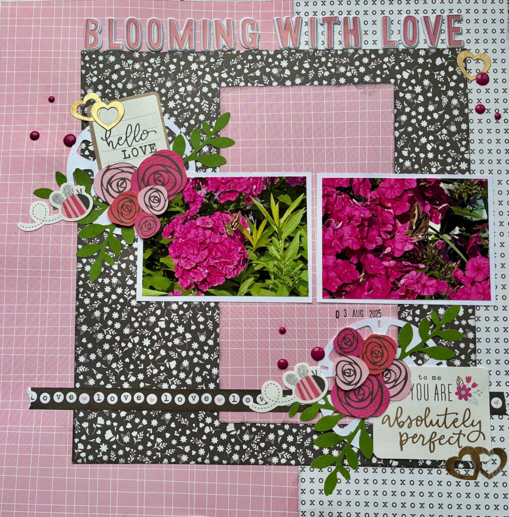 In my “Blooming With Love” layout, I used bold pink florals and heart accents to document flowers in bloom, not Valentine’s Day. The title works great for a garden story, and the color palette enhances the photos. The love theme becomes about loving nature, the season, the moment, and of course, my flowers.
