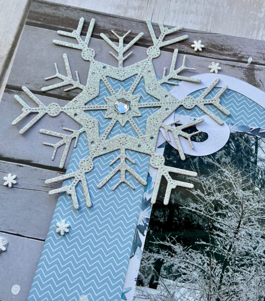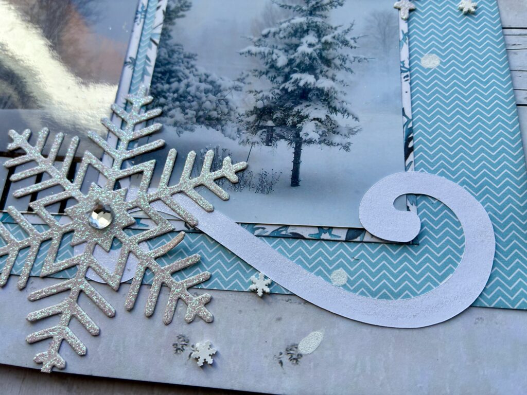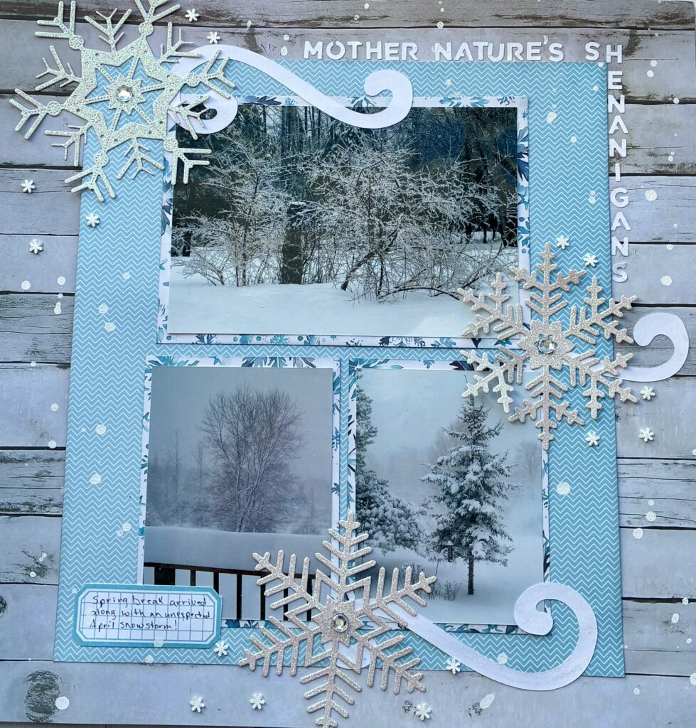 Using the sketch, I created a layout that captures the irony of a winter wonderland in the middle of spring break. The layered photos and large snowflake embellishments emphasize the chill in the air, while the soft blues keep everything seasonal.