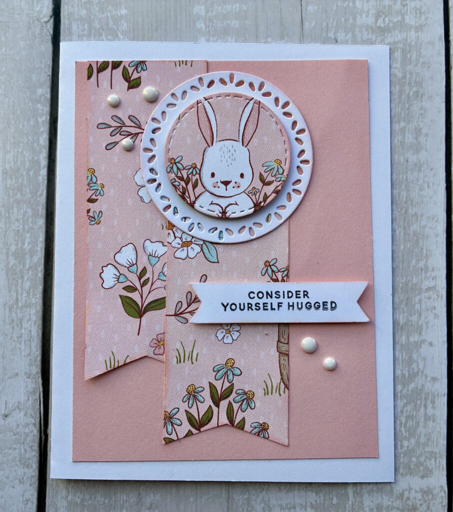 Now let’s have some fun, taking that same sketch and shrinking it down into a card! This is a favorite “shenanigan” in crafting, re-imaging a layout design into a completely different format. For the card I simplified the elements, but kept the core structure. The circular focal point became an adorable bunny centerpiece, and the layered banners echoed the original design using arrows. The result is a sweet, spring inspired card that feels completely different from a snowy layout, yet still used the same sketch.