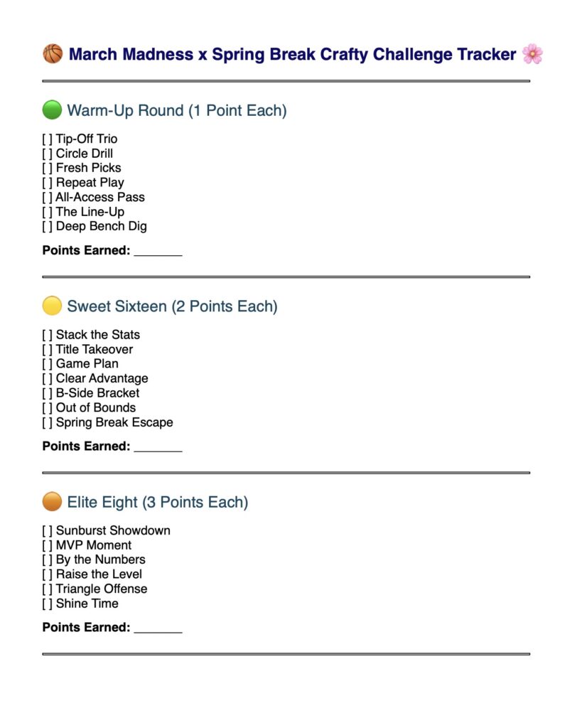 Downloadable/Printable PDF: March Madness X Spring Break Crafty Challenge Tracker