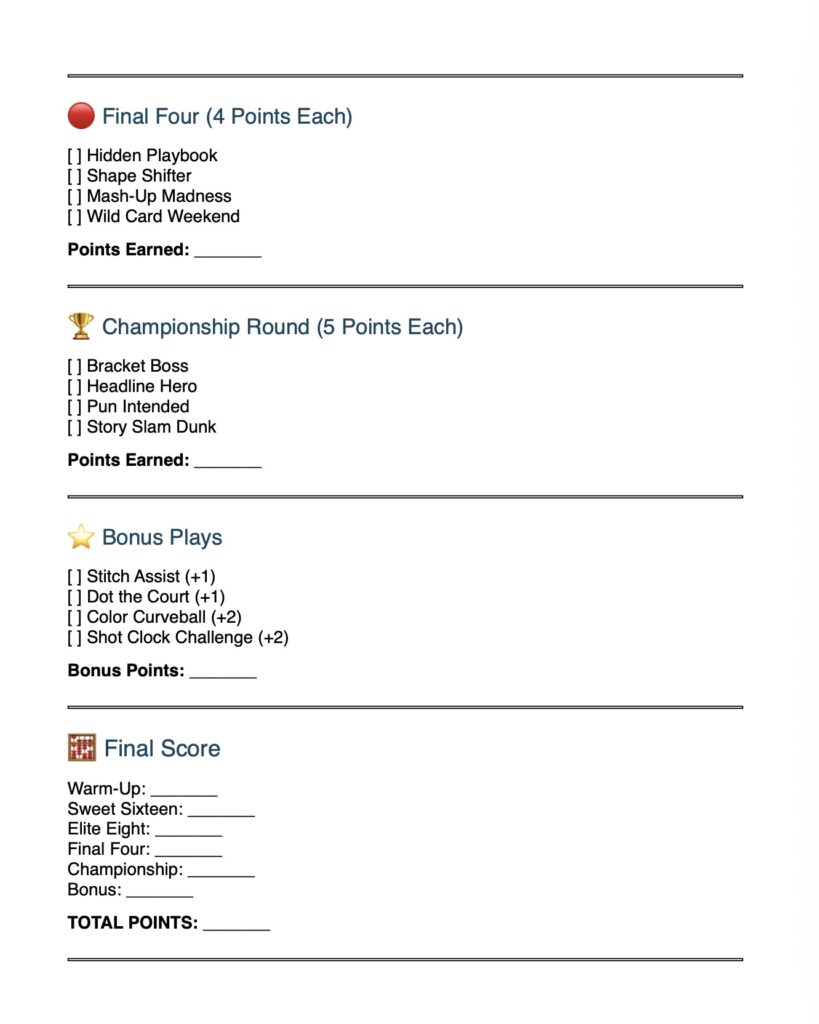 Here is a printable tracker sheet to keep track of your March Madness x Spring Break Challenge! It’s just meant as a quick way to tally points, so if you want to remember the details of each challenge you will have to handwrite those in after you print.